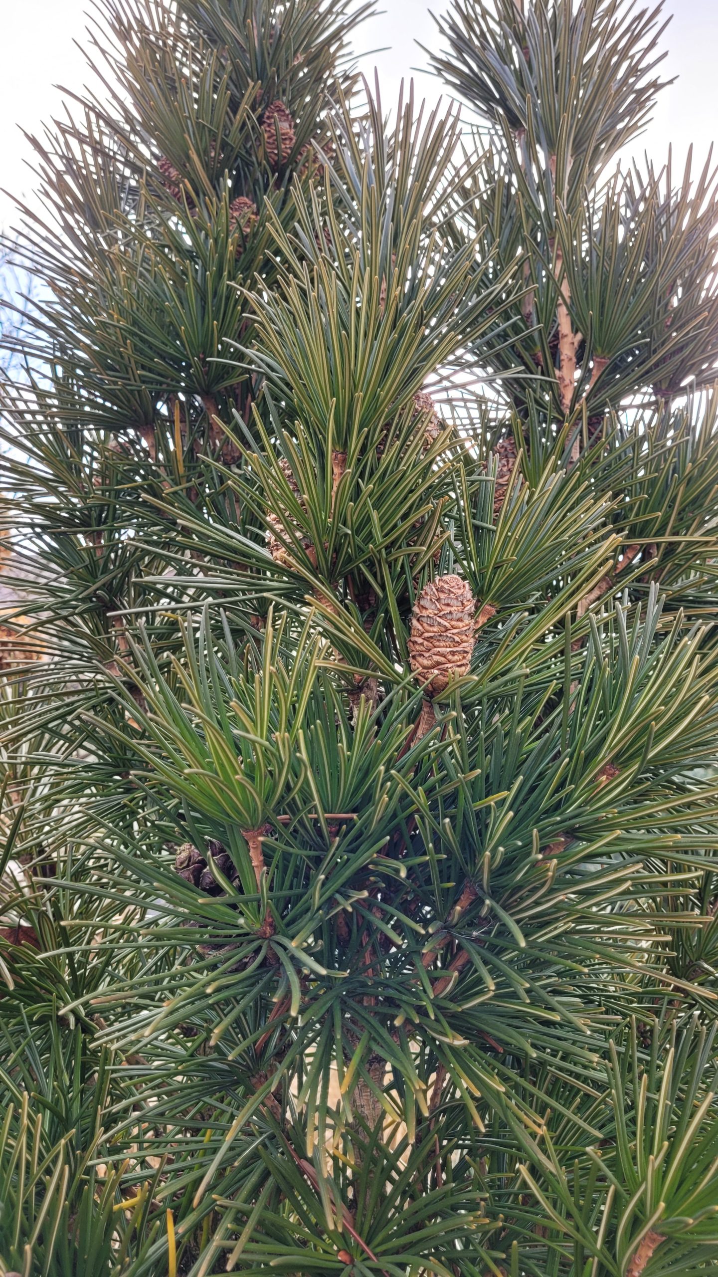 - Liście (igły): Bardzo charakterystyczne, nie przypominające typowych igieł sosnowatych. W rzeczywistości są to przekształcone pędy przypominające igły, zebrane w okółkach po 10–30 sztuk. Są ciemnozielone, błyszczące, mięsiste i elastyczne, osiągają długość 5–12 cm.