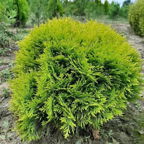 Tuja kulista 'Mirjam’ to karłowa odmiana żywotnika zachodniego (Thuja occidentalis) o zwartym, kulistym pokroju i intensywnie złocistożółtym ulistnieniu. Jest to jedna z najcenniejszych odmian iglaków o dekoracyjnych walorach, idealna do ogrodów przydomowych, skalniaków oraz do uprawy w pojemnikach.